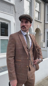 Herre 3-delt jakkesæt i uld, tweed, sildebensmønster, brun, blå, tern, 1920'er Gatsby
